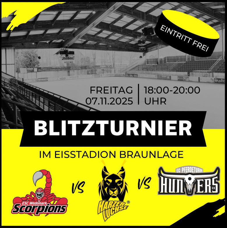 Am 07.11.2025 veranstalten die Harzer Luchse ein Hobbyeishockey-Blitzturnier im Eisstadion am Wurmberg. Zur Primetime am Freitagabend von 18 bis 20 Uhr begrüßen wir die Wedemark Scorpions 1c